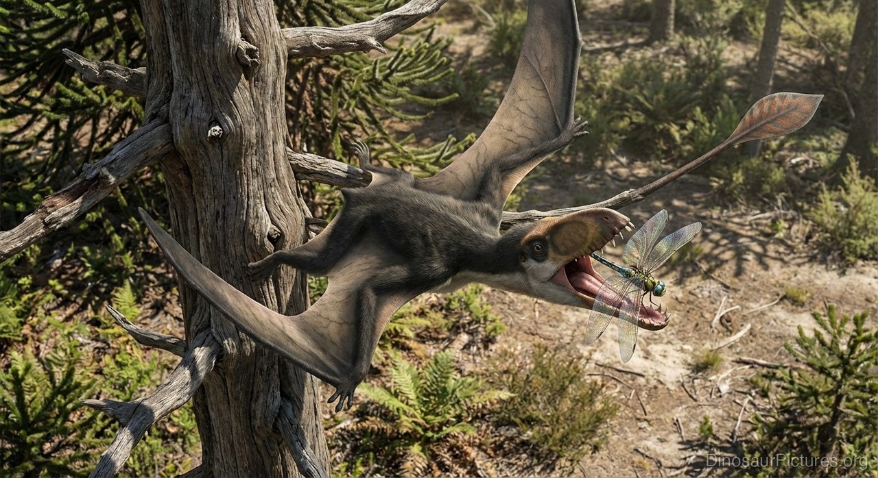 The pterosaur family began in the Triassic, with long tails and plenty of teeth. By the time they were wiped out 63 million years ago, tails were shorter and beaks tended to be toothless. What did Scaphoghathus eat? Scientists speculate that he skimmed the water and seized small fish near the surface in his long, narrow jaws. This is assumed to be a common feeding pattern, with flying insects as a supplementary form of food.